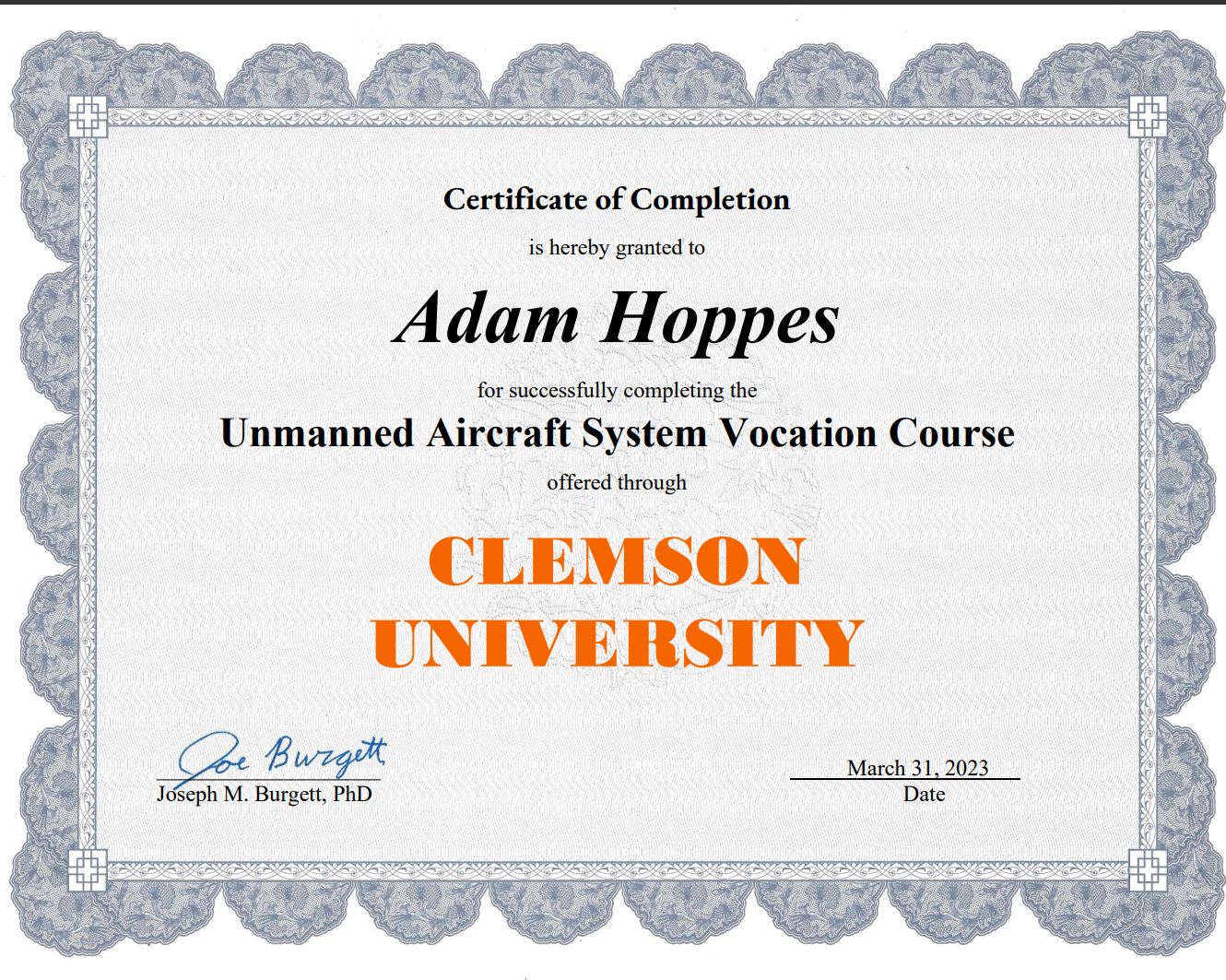 With over two years of drone experience and education I have become very qualified to serve you. I’ve gone through extensive schooling and research, which have granted me multiple certifications and a license. I have also completed multiple classes specific to this industry so I can better suit your needs. From Clemson University, I have a Certificate in “Thermography Level 1” & “APSA BPERP Flight Proficiency”. As well I am an FAA Licensed Remote Pilot.